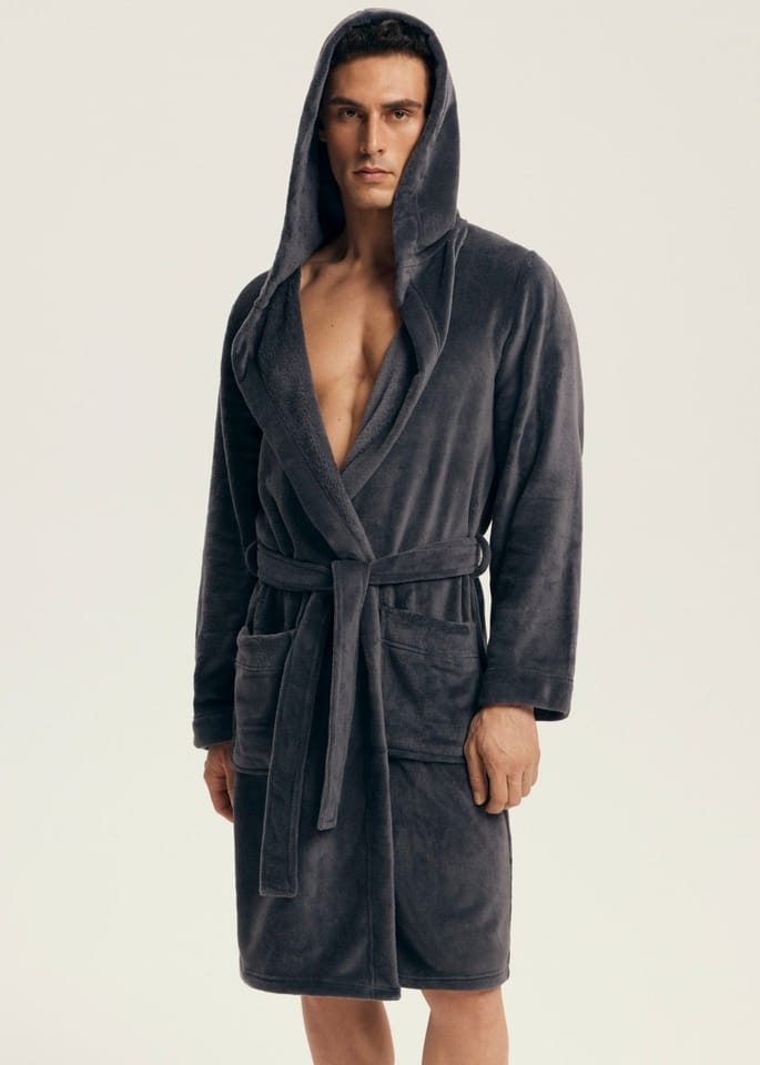 Szlafrok męski z kapturem i wygodnymii kieszeniami po bokach, wykonany z miękkiego i delikatnego materiału, który idealnie sprawdzi się do chodzenia po do domu jak i po kąpieli. Klasyczny fason z wiązaniem w pasie. Skład: 100% poliester.