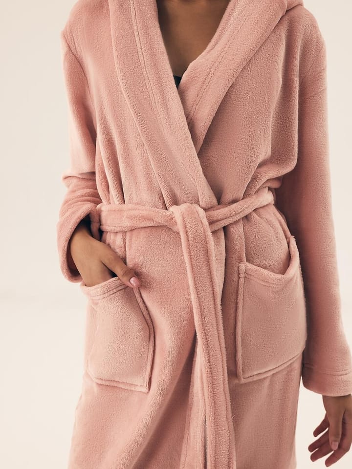 Szlafrok damski gładki i jednolity z super miękkiej dzianiny. Posiada długi rękaw, kaptur i kieszenie na biodrach. Wiązany w pasie, długość dokolan. Skład: 100% poliester.