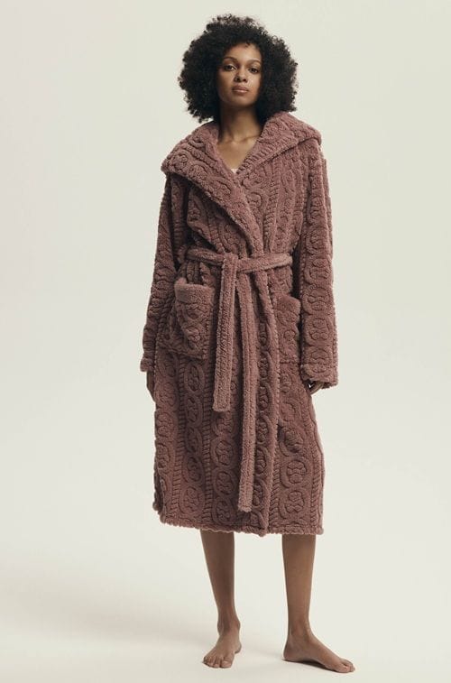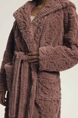 Długi szlafrok damski z kapturem z miękkiej dzianiny z wytłaczanym, wypukłym, grubym wzorem. Długi rękaw, wiązany w pasie. Po bokach dwie zewnętrzne kieszenie. Skład: 100% poliester.