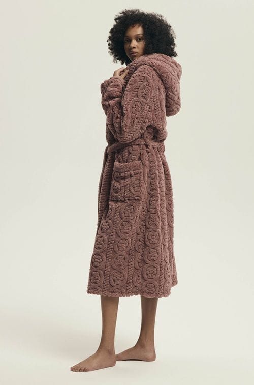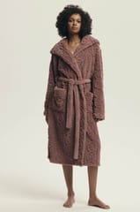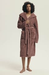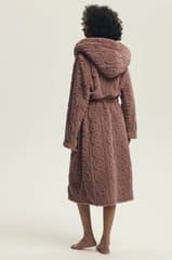 Długi szlafrok damski z kapturem z miękkiej dzianiny z wytłaczanym, wypukłym, grubym wzorem. Długi rękaw, wiązany w pasie. Po bokach dwie zewnętrzne kieszenie. Skład: 100% poliester.
