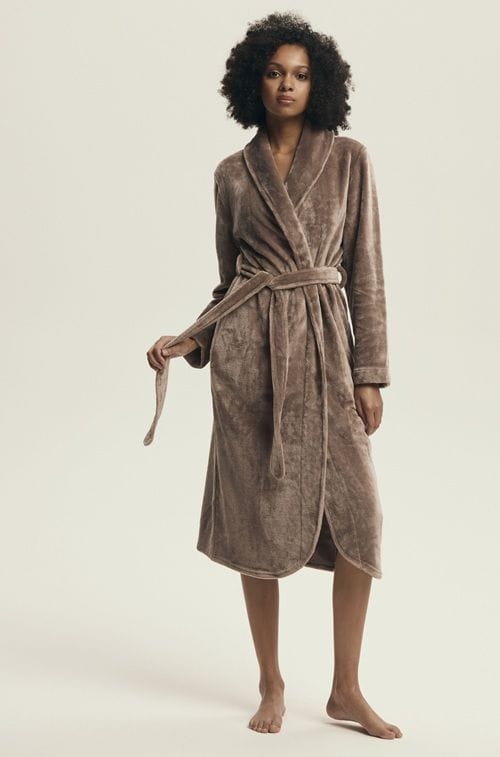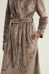 Szlafrok damski z kołnierzem, uszyty z miękkiej, gładkiej dzianiny. Długość lekko za kolano, długi rękaw, wiązany w pasie. Dwie zewnętrzne, wygodne kieszenie. Skład: 100% poliester.