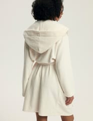 Szlafrok damski z kapturem z miękkiej, gładkiej i jednolitej dzianiny. Długość do kolan, długi rękaw, wiązany w pasie. Dwie zewnętrzne, wygodne kieszenie. Skład: 100% poliester.