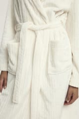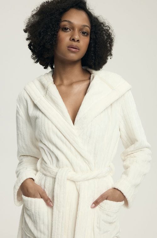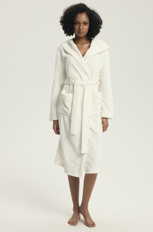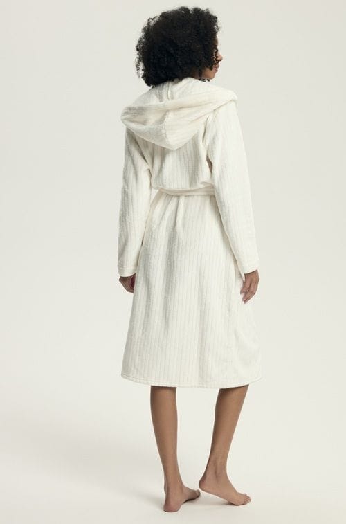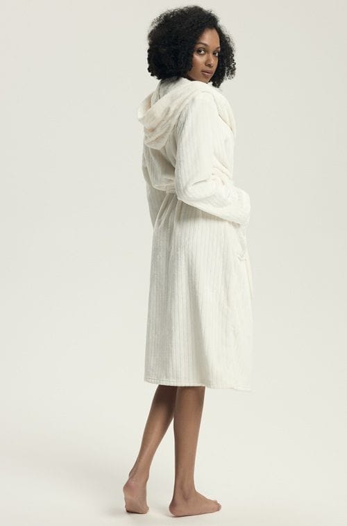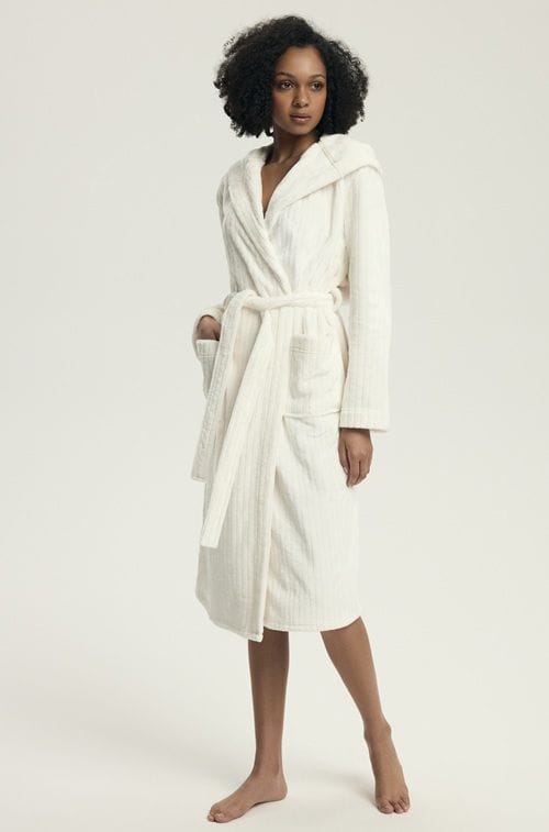 Szlafrok damski z kapturem z miękkiej, gładkiej dzianiny, ozdobiony delikatnym wzorem - pionowym tłoczeniem. Długość lekko za kolano, długi rękaw, wiązany w pasie. Dwie zewnętrzne, wygodne kieszenie. Skład: 100% poliester.