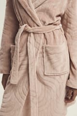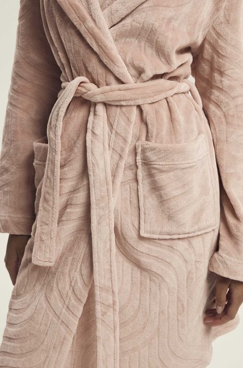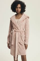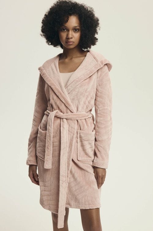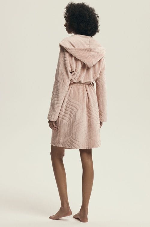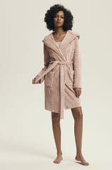 Szlafrok damski z kapturem z miękkiej, gładkiej dzianiny, ozdobiony delikatnym wzorem - tłoczeniem. Długość do kolan, długi rękaw, wiązany w pasie. Dwie zewnętrzne, wygodne kieszenie. Skład: 100% poliester.
