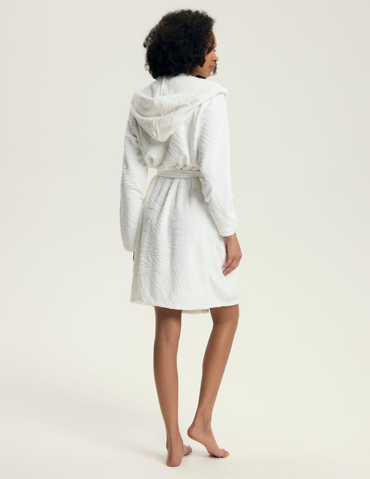 Szlafrok damski z kapturem z miękkiej, gładkiej dzianiny, ozdobiony delikatnym wzorem - tłoczeniem. Długość do kolan, długi rękaw, wiązany w pasie. Dwie zewnętrzne, wygodne kieszenie. Skład: 100% poliester.