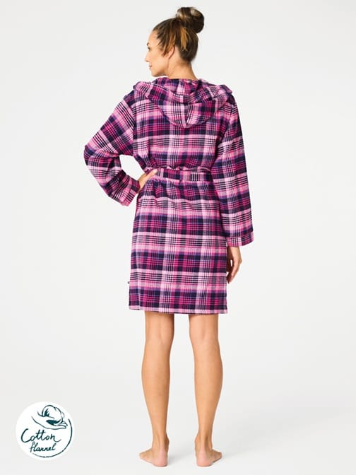 Lekki, całoroczny flanelowy damski szlafrok/podomka. Posiada kaptur, głębokie boczne kieszenie i pasek. Przy szyi dyskretny guziczek, który umożliwia zapięcie szlafroka wysoko. Długość przed kolano.Skład: 100% bawełna.