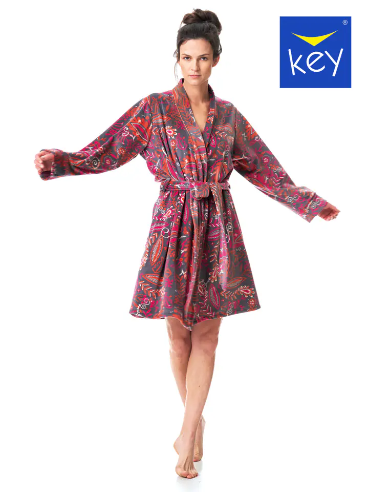 Szlafrok damski krótki z kołnierzem uszyty z wzorzystej tkaniny. Luźny, wygodny krój. Skład: 95% poliester,5% elastan.