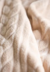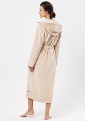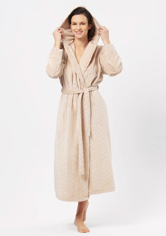 Elegancki szlafrok sięgający połowy łydki, wykonany z miękkiej i jedwabistej w dotyku dzianiny Velvet Super Soft we wzór z dekoracyjnym, ażurowym motywem warkocza. Skład: 100% poliester.