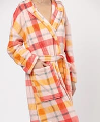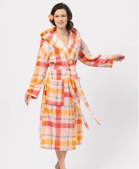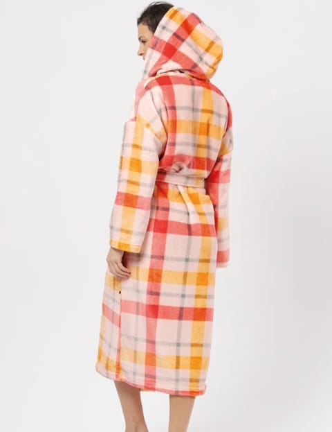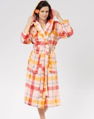 Elegancki, długi szlafrok damski z wyjątkowo miękkiej i puszystej w dotyku dzianiny Velvet Super Soft, która zapewnia trwałość i komfort noszenia. Szlafrok posiada kaptur, głębokie przednie kieszenie i szeroki pasek. Skład: 100% poliester.