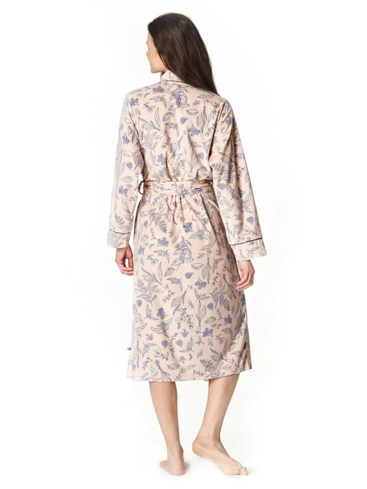 Zwiewna kobieca podomka o kroju kimona. Wykonana z cudownie miękkiej i lekkiej dzianiny, która pięknie podkreśla kobiecą sylwetkę. Rysunek niebieskich ziół w połączeniu z lekko morelowym odcieniem beżu daje przepiękny efektPo bokach głębokie kieszenie. W talii pasek.Podomka jest luźna w obwodzie. Od wewnątrz jest wiązana troczkami.Skład: 100% poliester