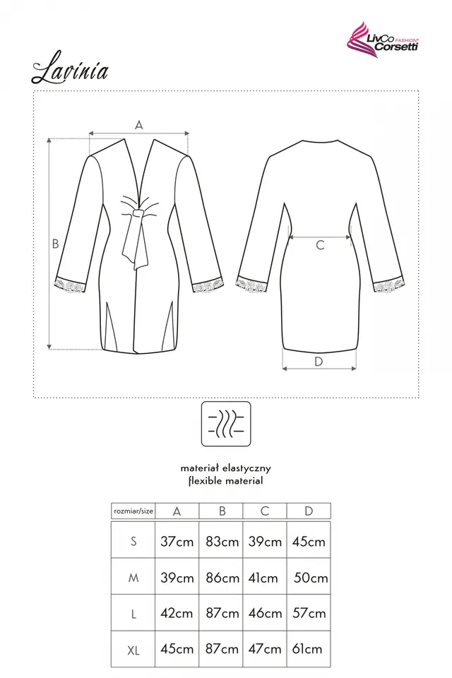 Pełen elegancji i wdzięki szlafrok o długości midi, wykonany z jakościowego, pieszczącego ciało materiału. Idealny dla kobiet w każdym wieku i o każdej figurze. W kolorze kości słoniowej. Ciekawie wiązany na pod biustem, z mechanicznymi marszczeniami zwracającymi uwagę na kształt kobiecej sylwetki i obfitość biustu. Długi rękaw szykownie zakończony koronkowym wzorem, a także zagięciami na długości przedramienia. Podobnie boczne poły szlafroku ozdobione zostały delikatną koronką. Lavinia idealnie nadaje się jako okrycie wierzchnie na zmysłową koszulkę nocną.