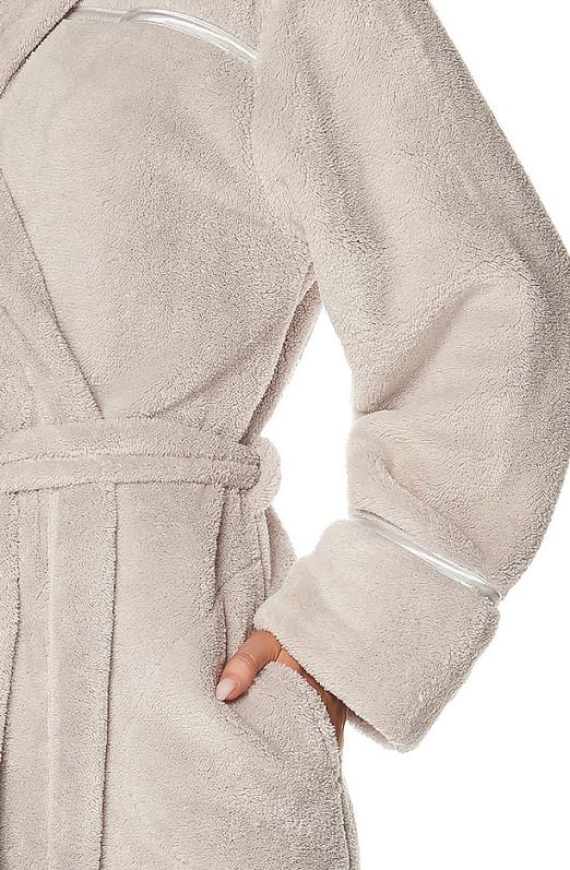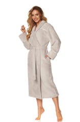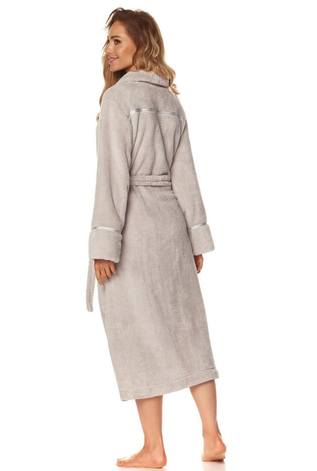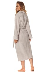 Szlafrok damski, długi wykonany z miękkiej dzianiny typu soft, z szalowym kołnierzem, ozdobiony satynowymi przeszyciami. Wiązany w pasie, po bokach kieszenie. Skład: 100% poliester.