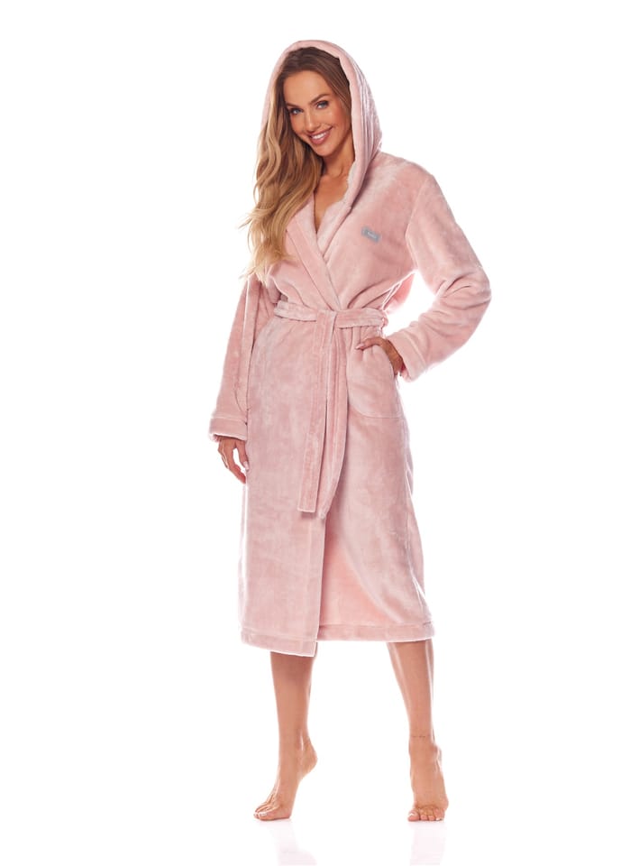 Szlafrok damski długi z kapturem, wiązany w pasie. Kaptur od środka obszyty przyjemnym futerkiem. Skład: 100% poliester.