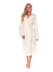 Szlafrok damski długi z kapturem wykonany z mięciutkiej i przyjemnej dzianiny. Na wysokości piersi aplikacja. Wiązany w pasie, z kieszeniami. Skład: 100% poliester.