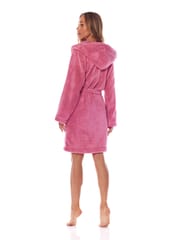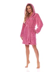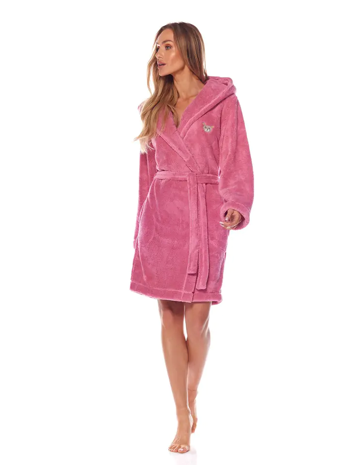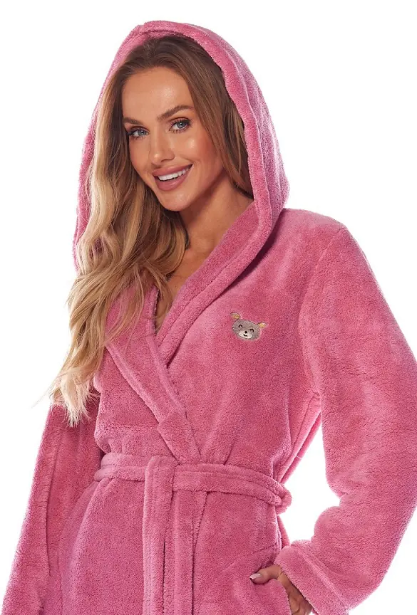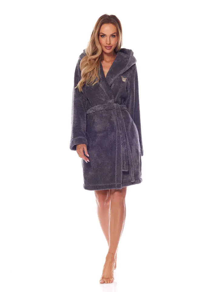 Krótki szlafrok damski z kapturem wykonany z miękkiej dzianiny. Na wysokości klatki piersiowej delikatna aplikacja. Wiązany w pasie, po bokach kieszenie. Skład: 100% poliester.
