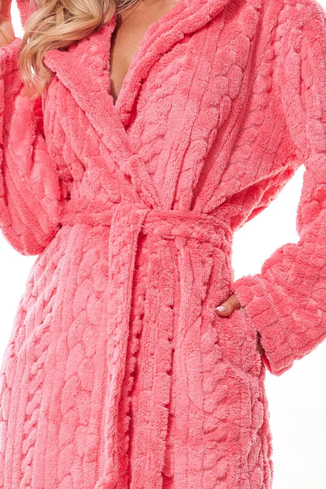 Krótki szlafrok damski z kapturem wykonany z miękkiej dzianiny z wytłaczanym, wypukłym wzorem. Wiązany w pasie, dwie zewnętrzne kieszenie. Skład: 100% poliester.
