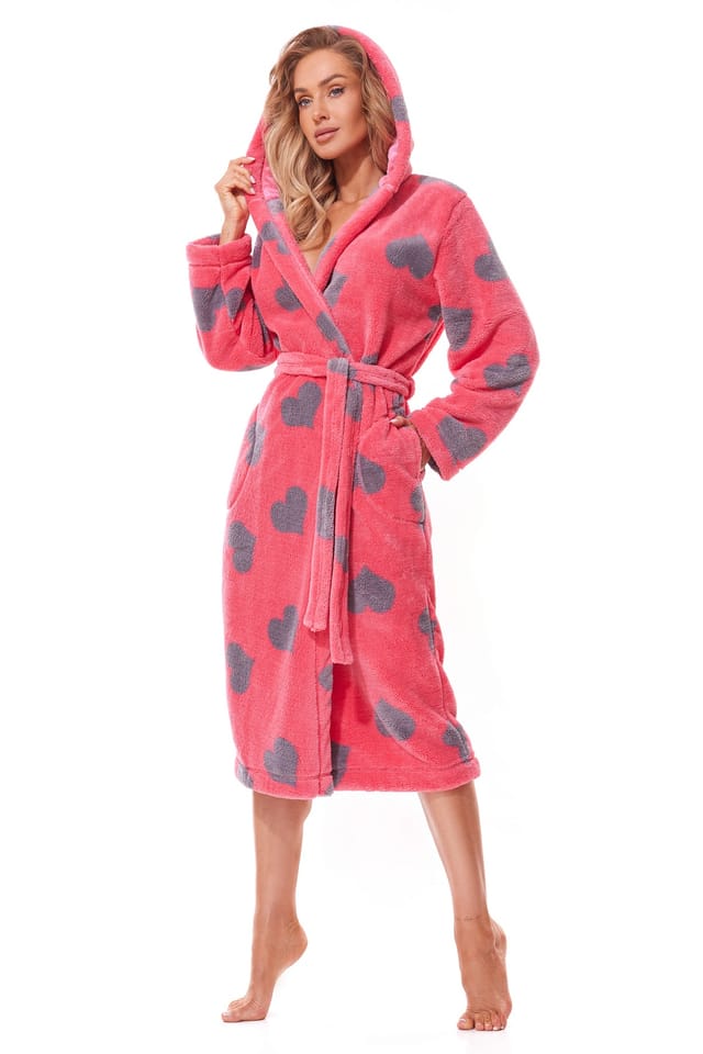 Wyjątkowo ciepły i przyjemny w dotyku szlafrok damski długi z kapturem. Wzór w serca, wiązany w pasie, posiada wygodne kieszenie. Skład: 100% poliester.