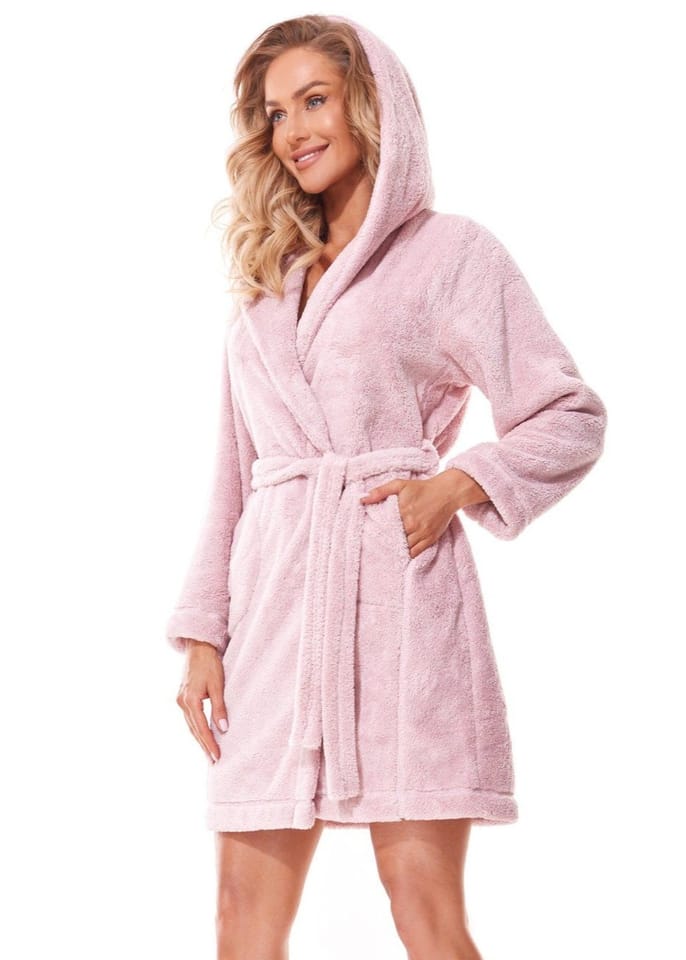 Krótki szlafrok damski wykonany z ciepłej, przyjemnej dla ciała dzianiny. Szlafrok z obszernym kapturem, tył pleców ozdobiony wytłaczanym napisem "END". Na wysokości bioder znajdują się praktyczne kieszenie. Skład: 100% poliester.