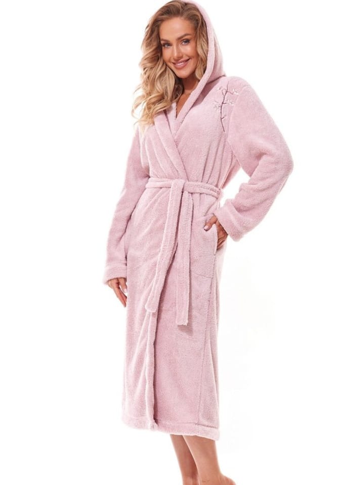 Szlafrok damski długi z kapturem. Ozdobiony delikatną aplikacją. Posiada wygodne kieszenie, wiązany w pasie. Skład: 100% poliester.