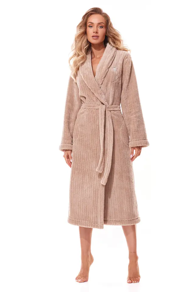 Długi szlafrok damski z kołnierzem wykonany z miękkiej dzianiny w prążek. Na wysokości klatki piersiowej aplikacja. Wiązany w pasie, po bokach kieszenie. Skład: 100% poliester.