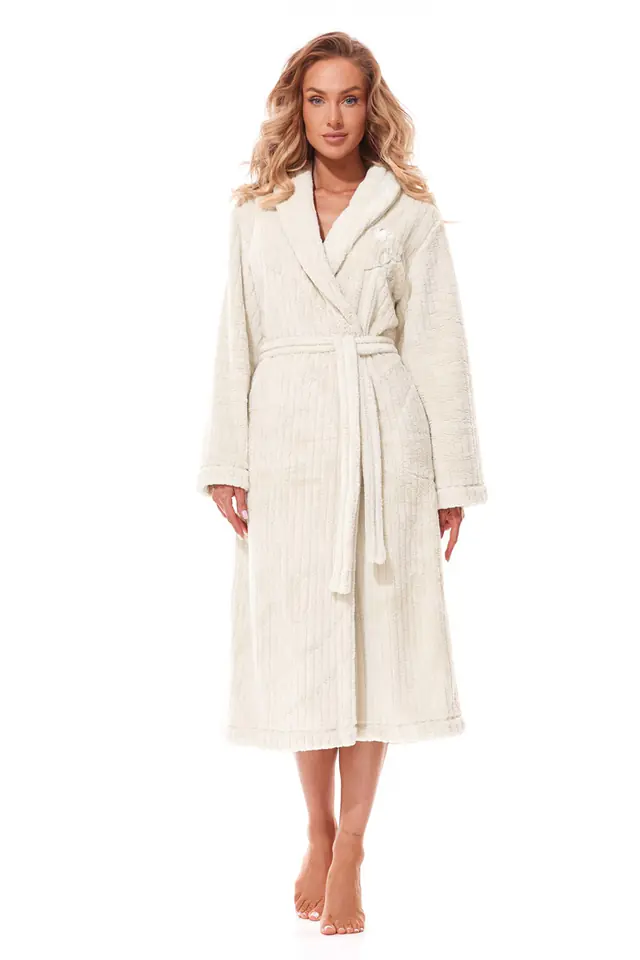 Długi szlafrok damski z kołnierzem wykonany z miękkiej dzianiny w prążek. Na wysokości klatki piersiowej aplikacja. Wiązany w pasie, po bokach kieszenie. Skład: 100% poliester.