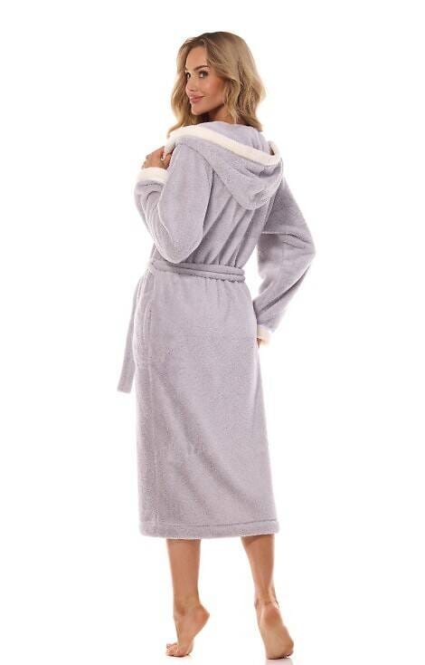 Długi, wygodny szlafrok z kapturem i kieszeniami z miękkiej tkaniny typu Soft. Na wysokości klatki kwiatowa aplikacja, wiązany w pasie, ozdobiony satynowymi przeszyciami. Skład: 100% Poliester.