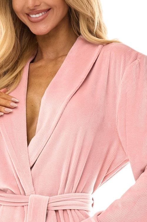Długi szlafrok z materiału w drobny prążek imitujący sztruks. Szalowy kołnierz, długi rękaw, wiązany w pasie z wygodnymi kieszeniami po bokach. Skład: 100% poliester.