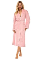 Długi szlafrok z materiału w drobny prążek imitujący sztruks. Szalowy kołnierz, długi rękaw, wiązany w pasie z wygodnymi kieszeniami po bokach. Skład: 100% poliester.
