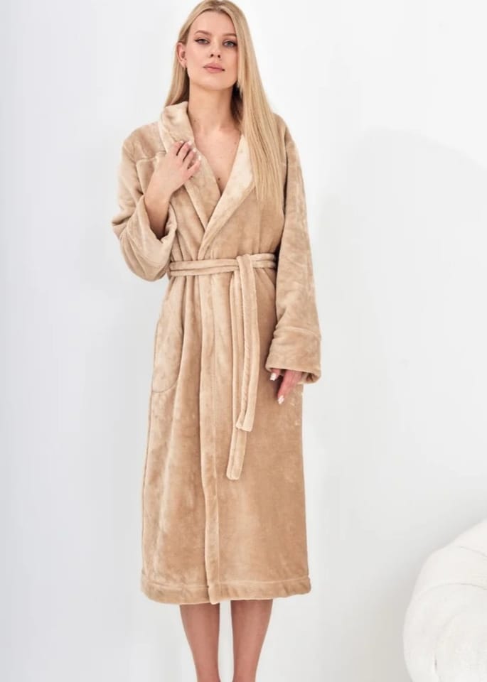Miękki i niezwykle przyjemny w dotyku szlafrok damski długi z kołnierzem. Posiada wygodne kieszenie, wiązany w pasie. Skład: 100% poliester.