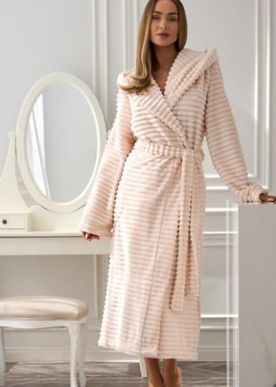 Długi szlafrok damski z miękkiej, ciepłej dzianiny ozdobionej wypukleniami w poziome, grube pasy. Posiada wiązanie w pasie, długi rękaw,kaptur i wygodne kieszenie na biodrach. Skład: 100% poliester.