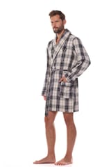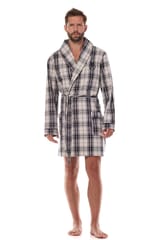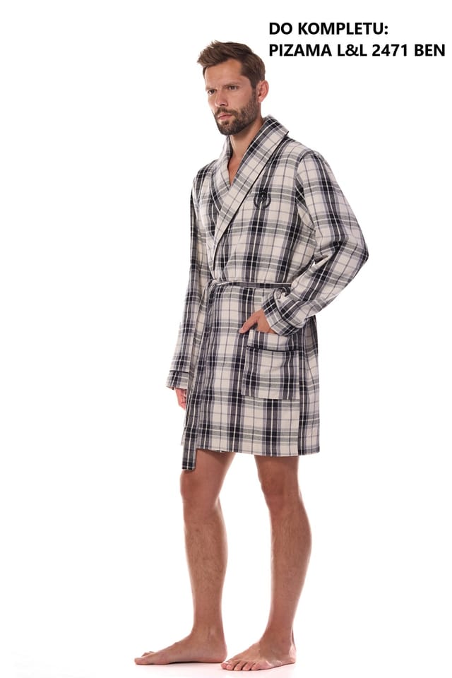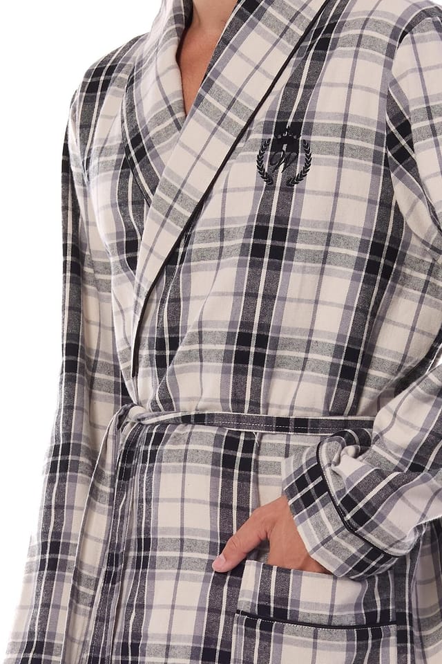 Krótki szlafrok męski z ciepłej flaneli w kratę o klasycznym fasonie. Po bokach kieszenie, wiązany w pasie, długość przed kolano. Na piersi ozdobny haft. Skład: 100% bawełna.