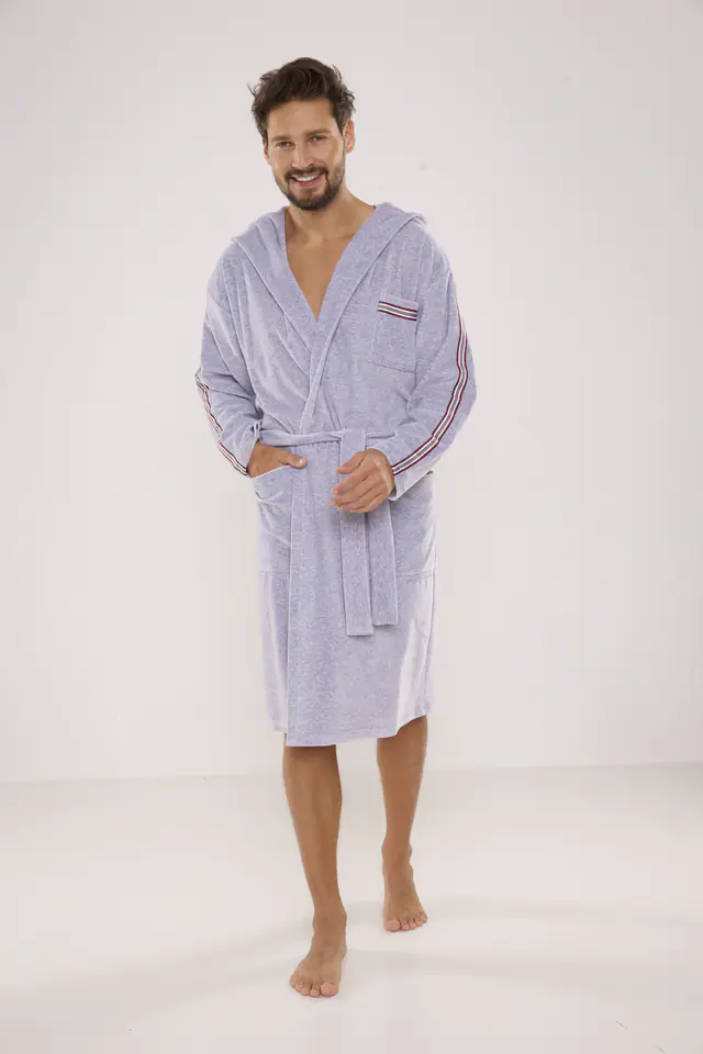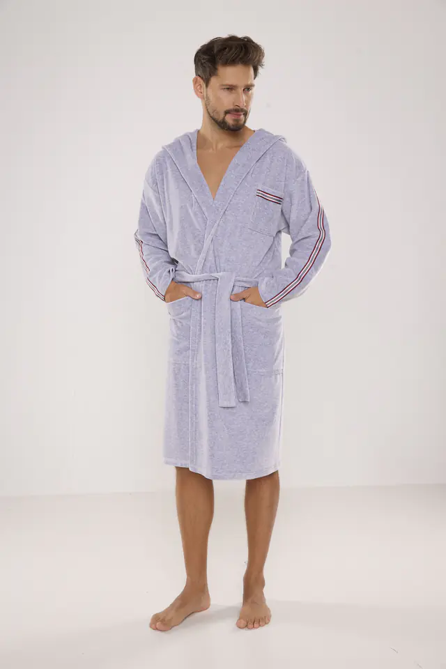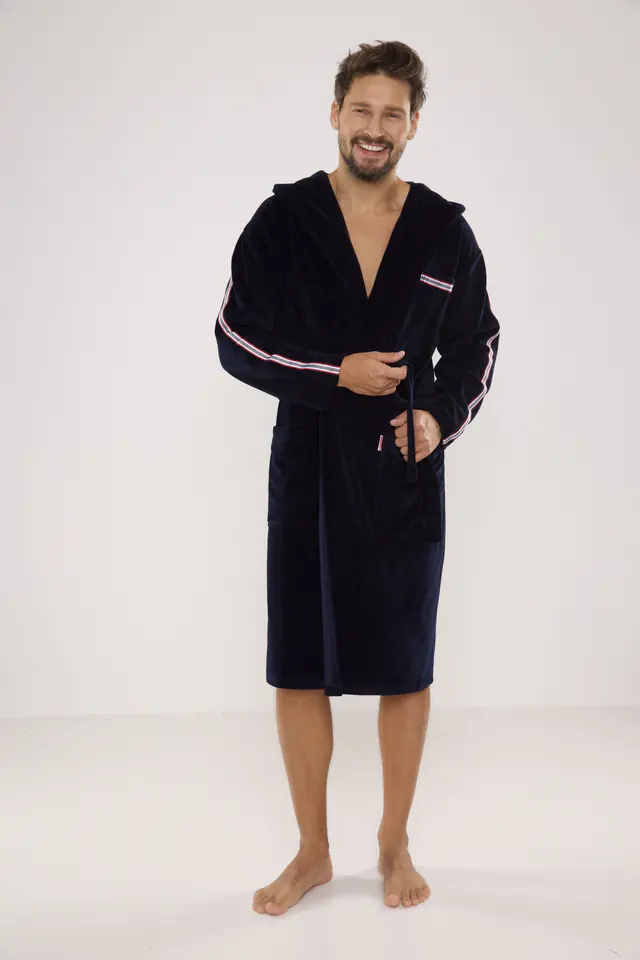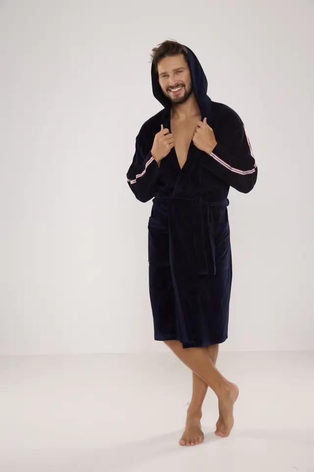 Welurowy męski szlafrok z kapturem został wykonany z wysokich jakościowo materiałów. Szlafrok na długi rękaw, wiązany w pasie. Na wysokości klatki piersiowej oraz biodrach znajdują się kieszenie. Rękawy i kieszonka ozdobione zostały czterokolorowymi lampasami.