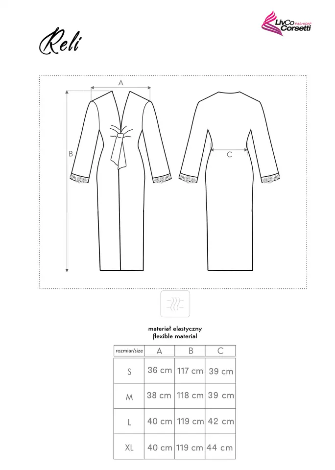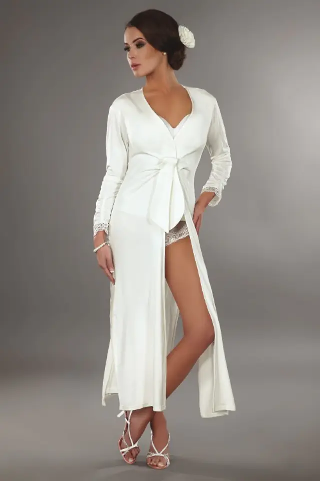 Gdyby Kleopatra szukała wyjątkowego szlafroka, z pewnością jej wybór padłby na unikalny szlafrok Reli. Już na pierwszy rzut oka widać, że jest to luksusowa propozycja na miarę królewskich wymagań. Szlafrok wykonany z mięciutkiego, kojącego ciało materiału. Na długi rękaw o kroju 3 i marszczeniach od łokci ku dłoniom, gdzie koniec stanowi kolorystycznie dopasowane koronkowe obszycie. Dość głęboki dekolt i oryginalne wiązanie na poziomie pępka. Poniżej szlafrok ucina się z przodu, a ciągnie w tył i w dół, aż do poziomu kostek. To niezwykle modne szycie od zawsze fascynowało gwiazdy filmowe i celebrytki. Teraz również dla Ciebie, gdyż luksus jest Ci pisany.