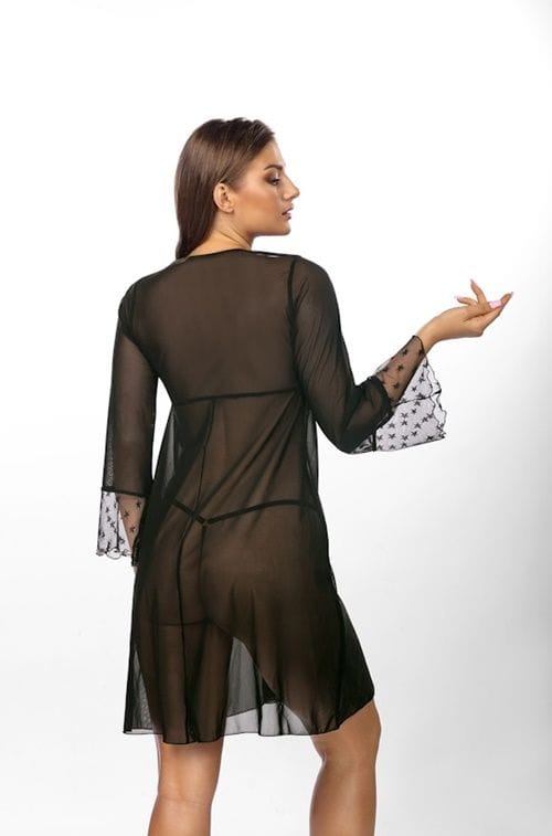 Zwiewny, zapinany z przodu peniuar uzupełniony kuszącymi prześwitami. Załóż go na nagie ciało lub zmysłowy komplet bielizny czy koszulkę nocną, a zyskasz efekt wart grzechu. Motyw czarnych gwiazdek dodaje charakteru i jeszcze bardziej podkreśla kuszący, niepokorny styl peniuaru. Sexy stringi w komplecie. Nasutniki nie stanowią kompletu. Skład: 90% poliamid, 10% elastan.