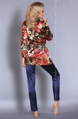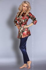 Jeśli znudziłaś się zwykłą piżamą czy koszulą nocną, ten zestaw może być idealny dla Ciebie. W zgodzie z najświeższymi, bieliźnianymi trendami - satynowy, wzorzysty i piękny. Każdą z części możesz śmiało mieszać także z innymi elementami własnej, bieliźnianej garderoby. Szlafrok ma elegancko wyprofilowany kołnierzyk, jest w wyraziste, czerwono-czarne kwiaty i wygodnie wiąże się go dołączonym do zestawu paskiem. Spodnie na gumce, granatowe w subtelne groszki. Skład: 95% poliester, 5% elastan.