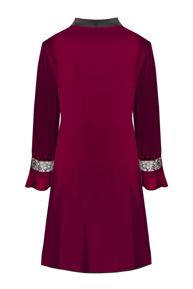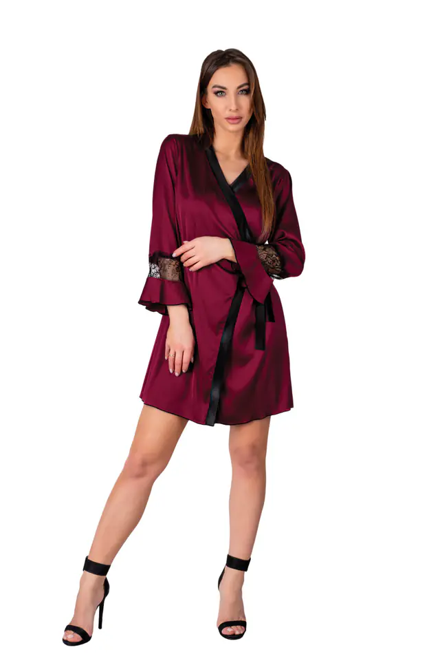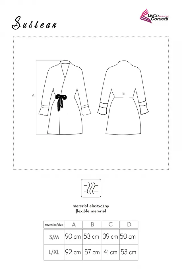 Sussean Cllaret Collection to aksamitny, elegancki i zmysłowy szlafrok wykonany z gładkiego, lśniącego materiału w kobiecym kolorze. Okrycie ma klasyczny fason z dekoltem na zakładkę. Jest zawiązywane w pasie za pomocą czarnej tasiemki, dopasowanej do elementów wykończenia szlafroka. Model sięga do połowy ud, pozwalając czuć się komfortowo. Jego największym atutem są jednak koronkowe wstawki przy rękawach długości 3/4, nadające charakter. Rozszerzane mankiety szlafroka Sussean Cllaret Collection dodają mu zaś wdzięku i kobiecości.