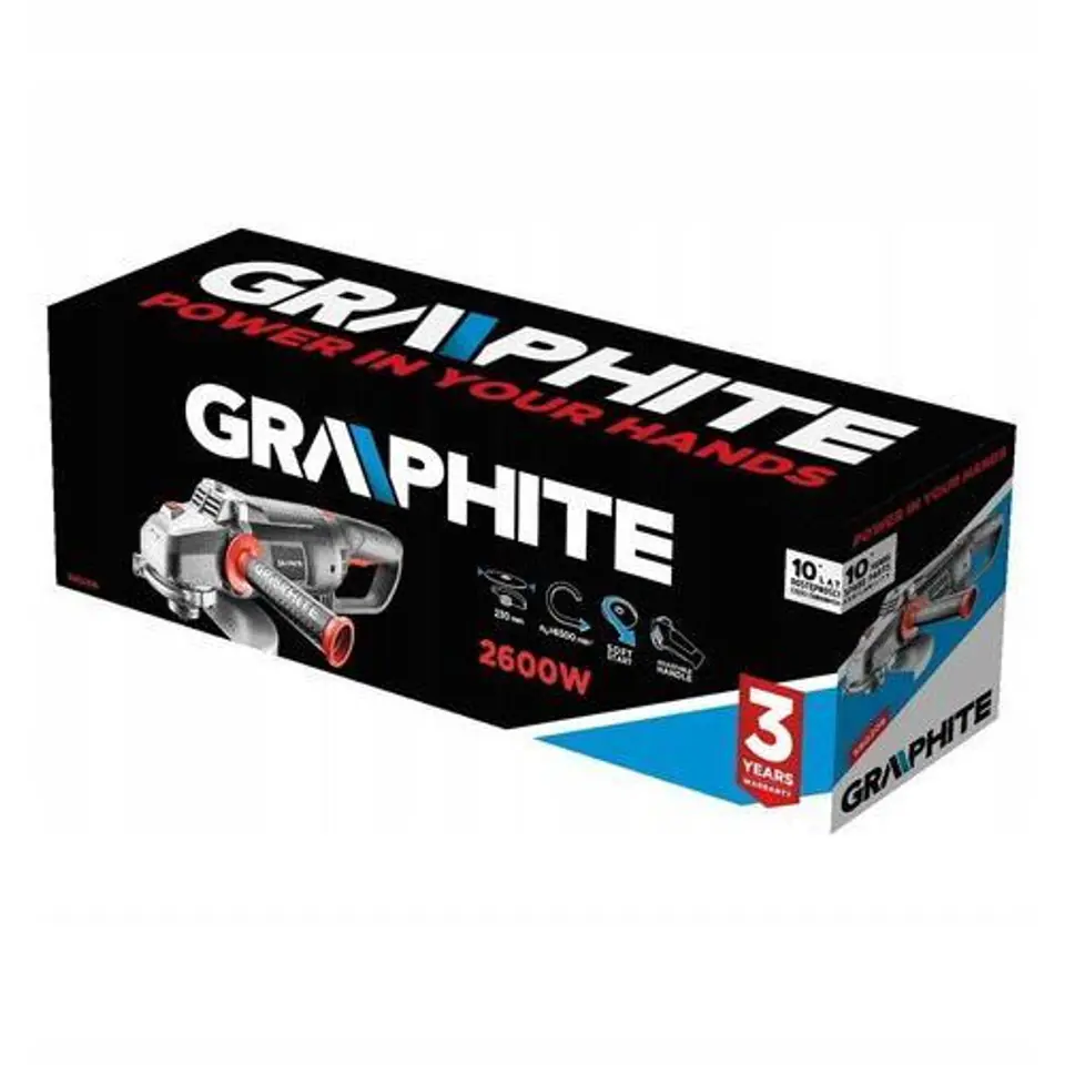 Wysokiej klasy szlifierka kątowa GRAPHITE z silnikiem o dużej mocy 2900 W, przeznaczona do cięcia, szlifowania i polerowania materiałów o zróżnicowanej strukturze i twardości. Tarcza szlifierki o średnicy 230 mm. Urządzenie dzięki ergonomicznemu kształtowi oraz dokładnemu wyważeniu zapewnia wysoki komfort pracy. Rękojeść główna z nakładką antypoślizgową oraz rękojeść dodatkowa z trójpozycyjnym mocowaniem zapewniają komfort pracy osobom prawo- i leworęcznym. Szlifierka dla bezpieczeństwa została wyposażona w dwustopniowy przycisk, uniemożliwiający przypadkowe włączenie oraz niewystający z obudowy przycisk blokady wrzeciona. Odpowiednie rozmieszczenie otworów wentylacyjnych zabezpiecza przed przegrzaniem silnika. Obudowa przekładni wykonana ze stopu aluminium znakomicie odprowadza ciepło, a także wzmacnia konstrukcję. Maksymalna prędkość obrotowa głowicy wynosi 6500 obrotów na minutę. Istnieje możliwość samodzielnej wymiany szczotek od zewnątrz. Ponadto szlifierka została wyposażona w długi elastyczny przewód z