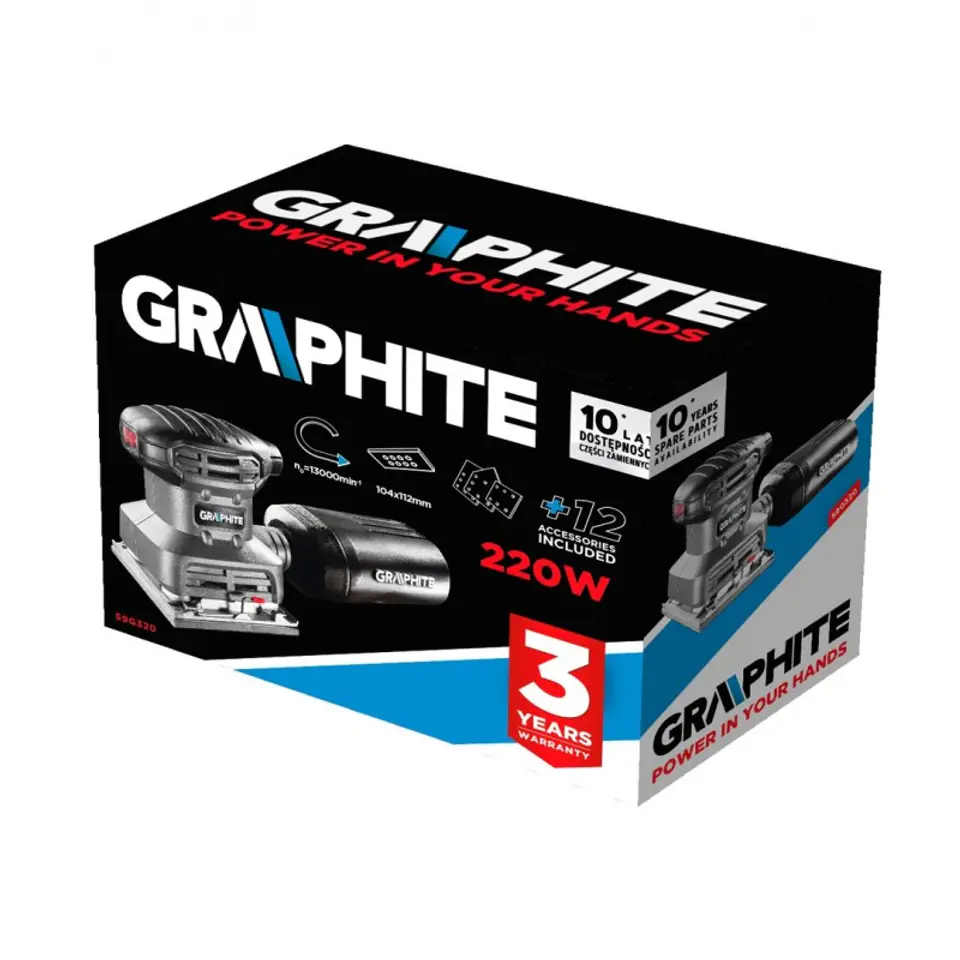 Szlifierka oscylacyjna 220W, stopa 104 x 112 mm, ilość oscylacji 26000 min, amplituda oscylacji 1 mm, akcesoria: 3 stopy wymienne, kwadratowa, prostokątna, trójkatna, papier ścierny 9szt, pojemnik na pył z filtrem - 1 szt; masa 1.2 kg