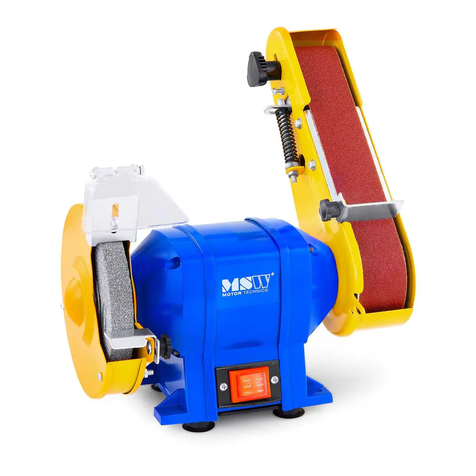 Praktyczna szlifierka taśmowo-tarczowa MSW dzięki swojej konstrukcji pozwoli na dwa sposoby szlifowania na jednej maszynie. Kamienna ściernica (śr. 150 mm, ziarnistość 36) i taśma szlifierska (szer. 50 mm, ziarnistość 80) znajdą zastosowanie przy polerowaniu, ostrzeniu czy przecinaniu różnych materiałów. Ściernicę i pas można samodzielnie zdemontować i wymienić na inne o tych samych wymiarach.