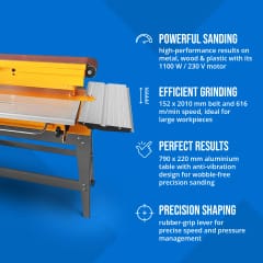- - Szlifierka stołowa z taśmą szlifierską 152 x 2010 mm i prędkością taśmy 616 m/min nadaje się nawet do szlifowania dużych elementów metalowych,