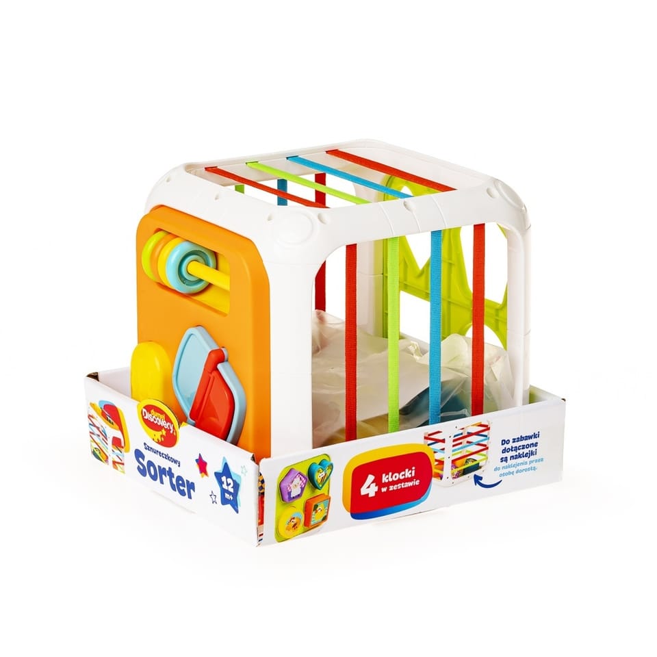 Ta kolorowa kostka to zaproszenie do wesołej zabawy! Zdobią ją sznureczki i sorter kształtów, a jedna z jej ścianek jest odpinana, co zapewnia wygodny dostęp do klocków. Poza tym, że ścianka ta jest odpinana, jest ona również dwustronna. Z jednej strony znajdują się trybiki do kręcenia, a z drugiej, ruchome elementy do przesuwania. Możliwość odpięcia ścianki pozwala zabrać ją ze sobą na wycieczkę, bez konieczności przewożenia całej kostki.