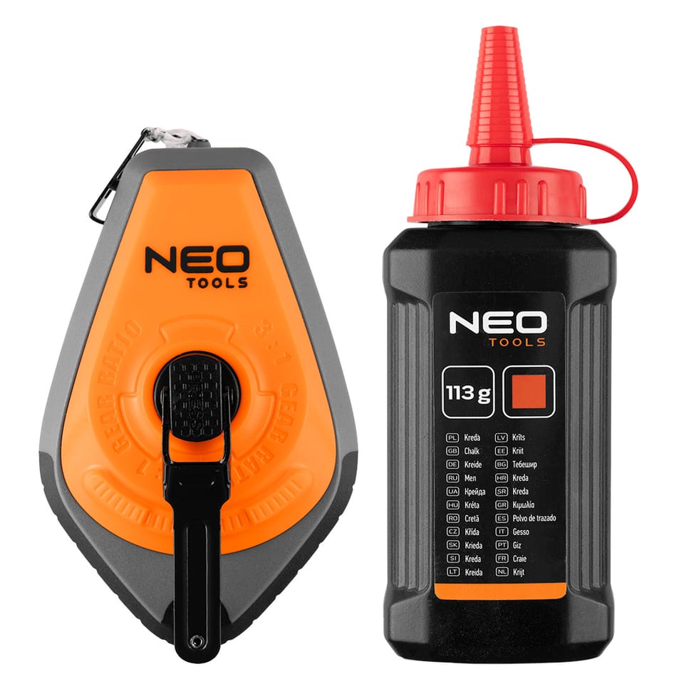 Sznurek traserski 30 m, obudowa z ABS + TPR, system szybkiego zwijania sznurka (x3), sznurek bawełniany 30 m, blokada rozwijania szerokie okno do napełniania. W zestawie kreda