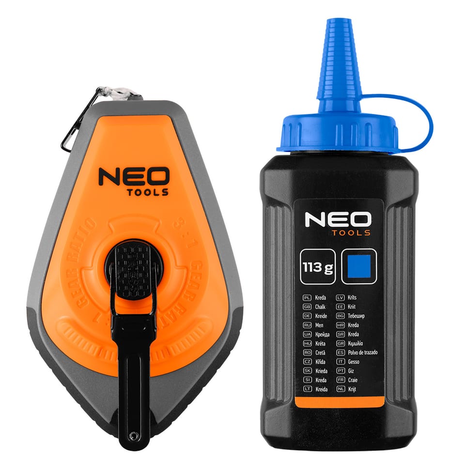 Sznurek traserski 30 m, obudowa z ABS + TPR, system szybkiego zwijania sznurka (x3), sznurek bawełniany 30 m, blokada rozwijania szerokie okno do napełniania. W zestawie kreda