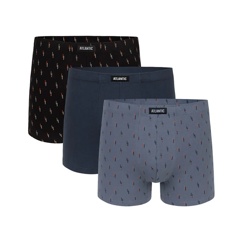 Szorty męskie o sportowym kroju. Niska talia, miękka i niepowodującą uciskania ciała guma tunelowa, na przodzie z logo Atlantic, oraz uniwersalnej długości nogawki. Doskonale dopasowują się do ciała. Pakowane po 3 szt. Skład: 95% bawełna, 5% elastan.