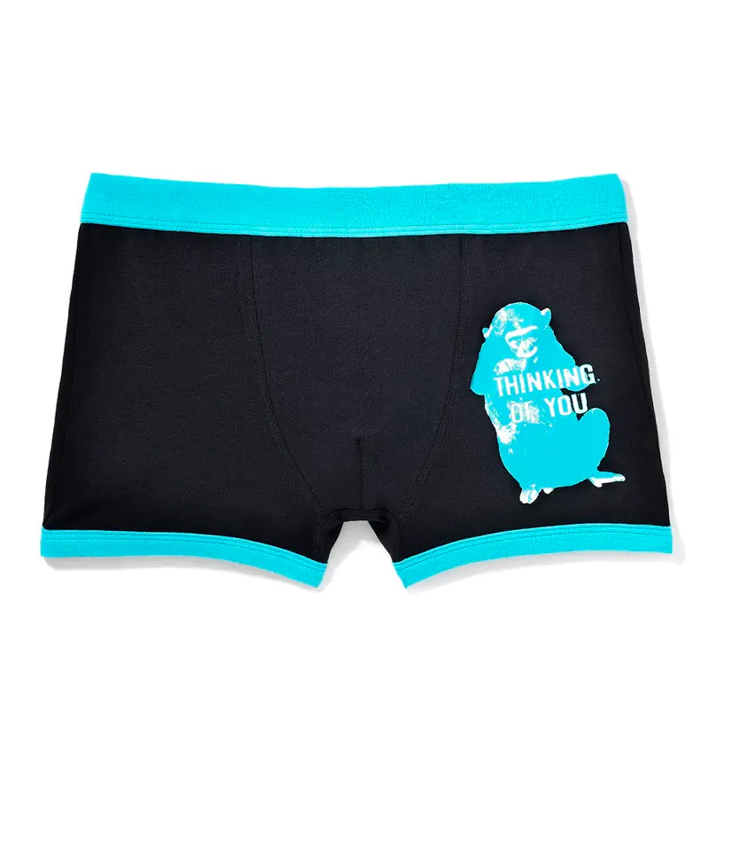 Szorty męskie. Miękki, zabawny nadruk z małpą i napisem THINKING OF YOU. Między nogawkami wszyty klin zapobiegający otarciom, podwyższający komfort noszenia.