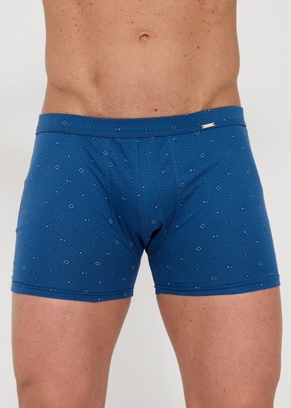 Szorty męskie z wysokiej jakości bawełny w delikatny, geometryczny wzór. Dopasowane, płaskie szwy, wygodna guma w pasie obszyta bawełną, bezuciskowe wykończenie nogawek. Skład: 95% bawełna, 5% elastan.