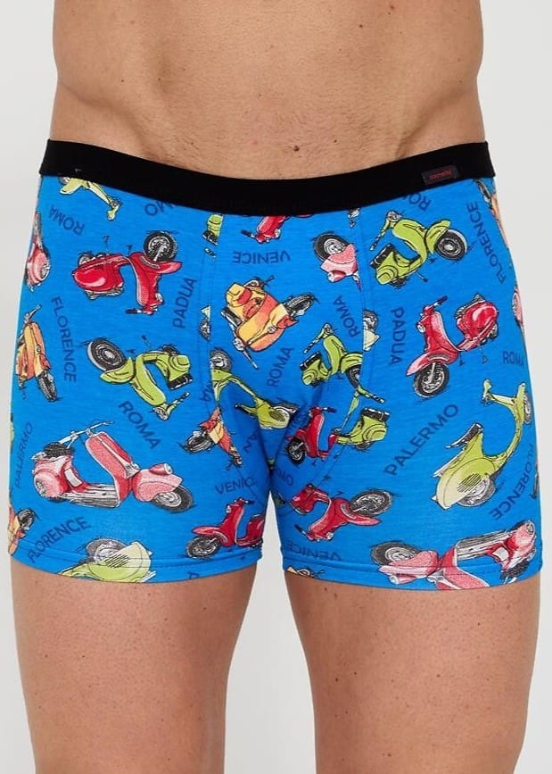 Bawełniane szorty męskie ozdobione kolorowym, zabawnym wzorem. Dopasowane, płaskie szwy, wygodna guma w pasie obszyta bawełną, bezuciskowe wykończenie nogawek. Skład: 95% bawełna, 5% elastan.