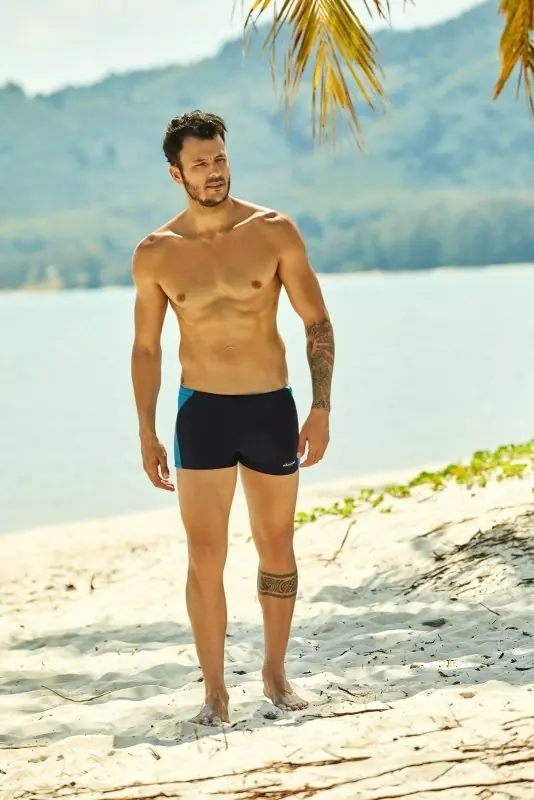 Szorty kąpielowe męskie z wysokiej jakości mikrofibry. Od wewnętrznej strony posiadają siateczkowe slipy, które pozwalają zachować komfort oraz sznureczek do regulacji obwodu. Skład: 80% poliamid, 20% elastan; podszewka 100% poliamid.