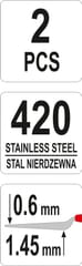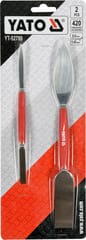 Szpachelki sztukatorskie dwustronne odgięte, wymiary- 8 x 192 mm i 26 x 254 mm , kształt łopatki liść i prostokąt, materiał sprężysta stal nierdzewna o symbolu 420s/s , część robocza szlifowana 1,45-0,6 mm, uchwyt na środku z tworzywa. Do precyzyjnych prac sztukatorskich i modelarskich