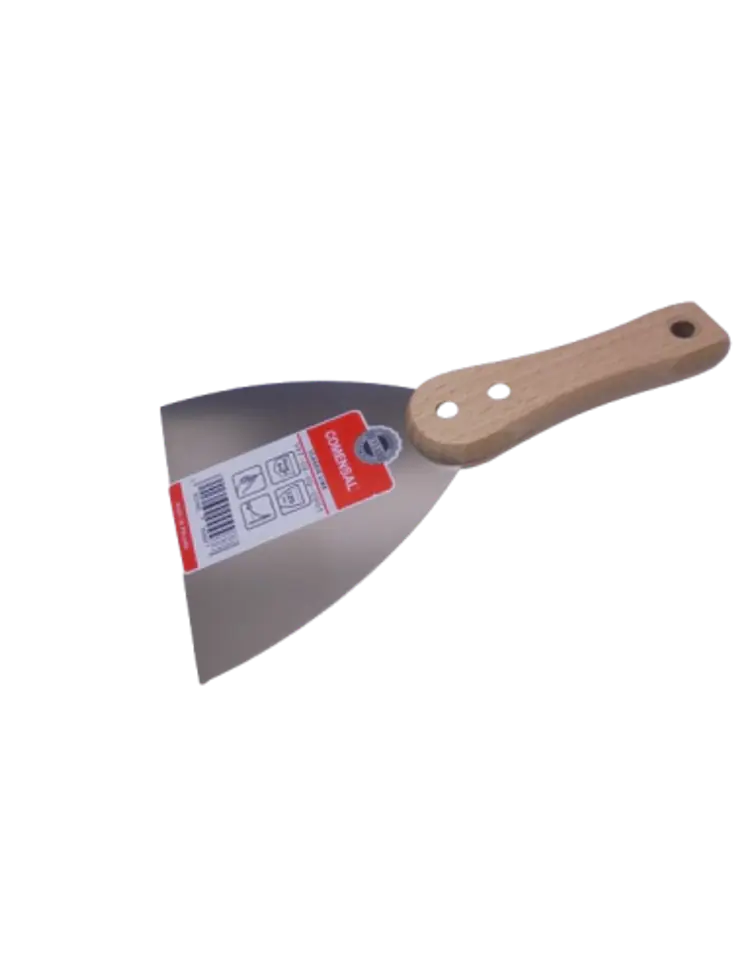 Uniwersalna szpachelka ze stali nierdzewnej wyposażona w drewniany uchwyt z to niezbędne narzędzie podczas większości małych i dużych prac remontowych, malarskich i budowlanych.